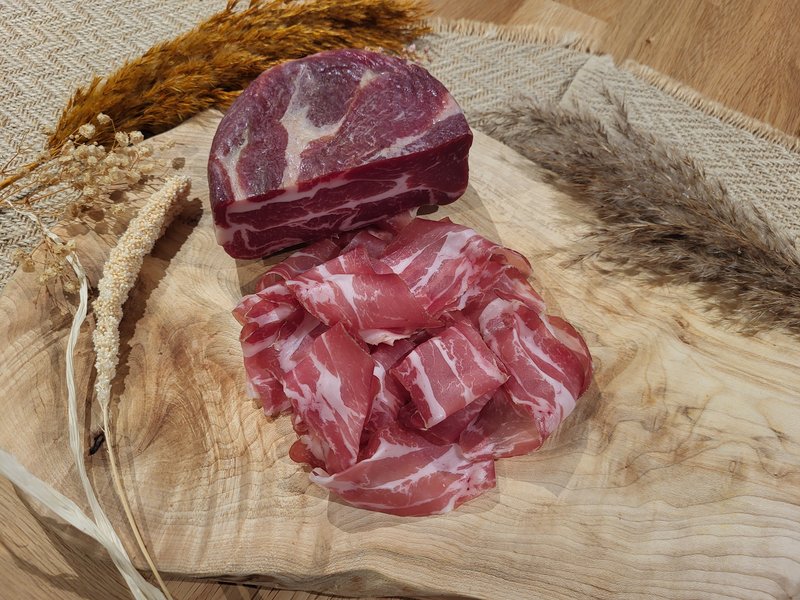 Coppa - die südschweizerische Trockenfleischspezialität ist auch bei uns bekannt und beliebt. Die luftgetrocknete Spezialität aus Schweinshals überzeugt mit ihrer ausgeprägten Marmorierung und dem anhaltenden Geschmack.